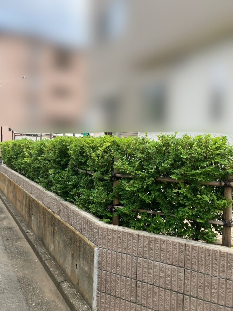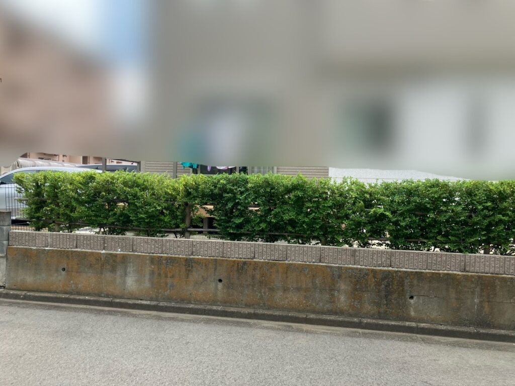 (写真だと若干わかりづらいかもしれませんが、無造作に伸びていたものを高さを揃え、道路側にせせりでていた部分を伐採、黄色くなっていた葉の除去、今後のメンテナンスのご案内等をさせていただいてます。)